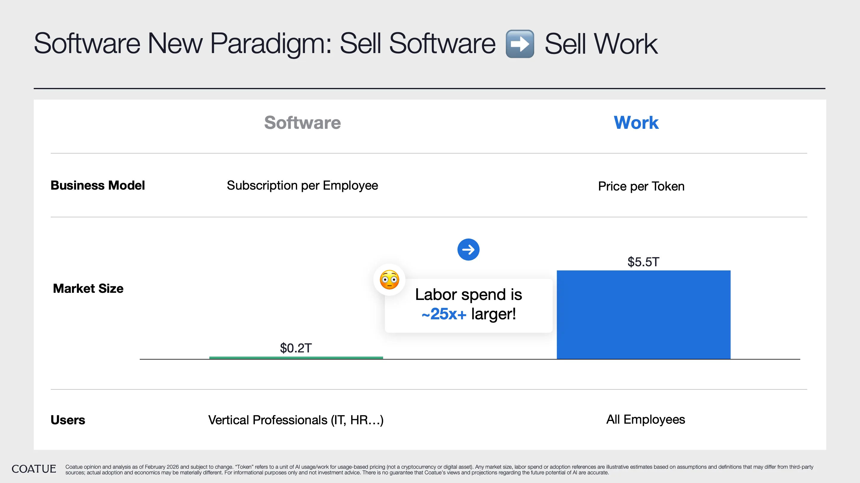 As AI labs outscale some of the most iconic software businesses in history, we are witnessing a fundamental shift in the unit of economic value: the transition from selling software (per-seat) to selling work (per-output).