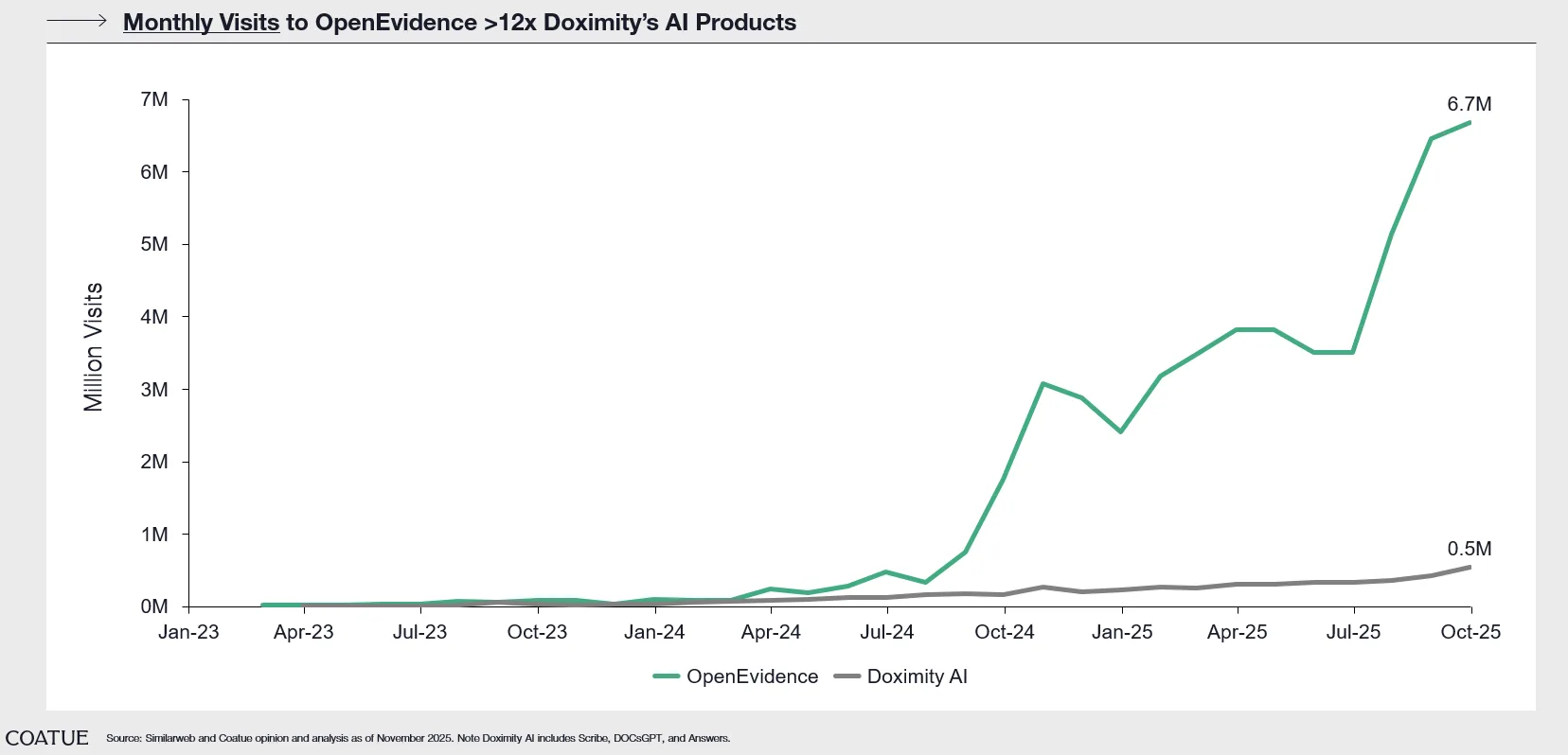 OpenEvidence drives significantly higher web traffic than Doximity AI: For much of the last decade, Doximity (a digital medical network with clinical tools) was treated as the benchmark for online physician engagement. OpenEvidence surpassed that benchmark — with over 12x the usage of Doximity’s AI tools as of October 2025. We see OpenEvidence becoming the new standard for the most widely used digital platform among U.S. physicians