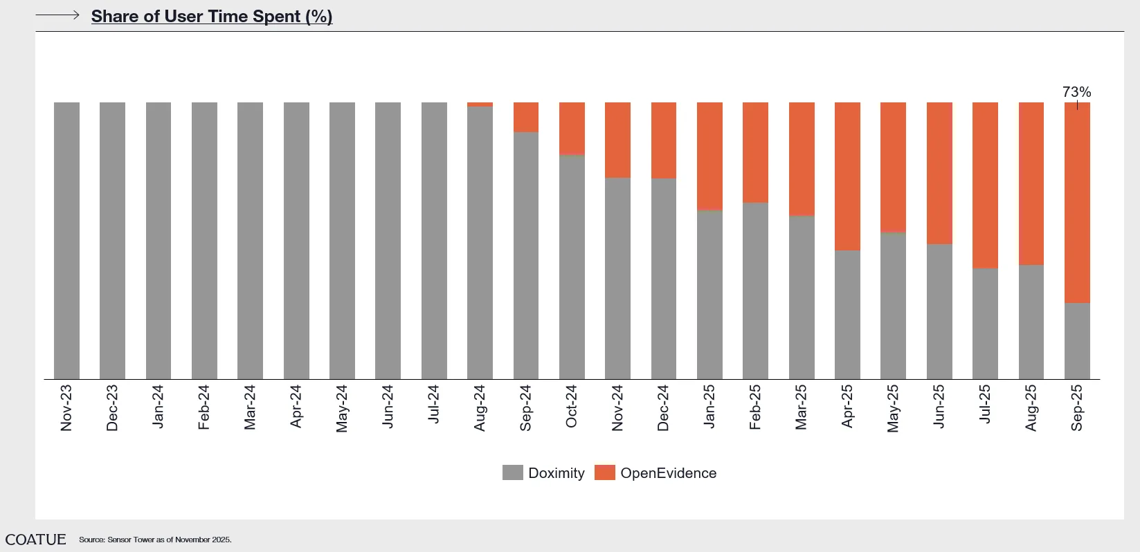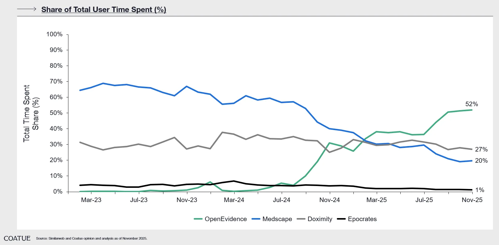Physicians spend more time on OpenEvidence than many of the leading clinical news & reference platforms: Clinical platforms like Medscape, Epocrates, and Doximity were traditionally staples in a doctor’s digital toolkit. Today, OpenEvidence has overtaken all of them in total time spent by doctors