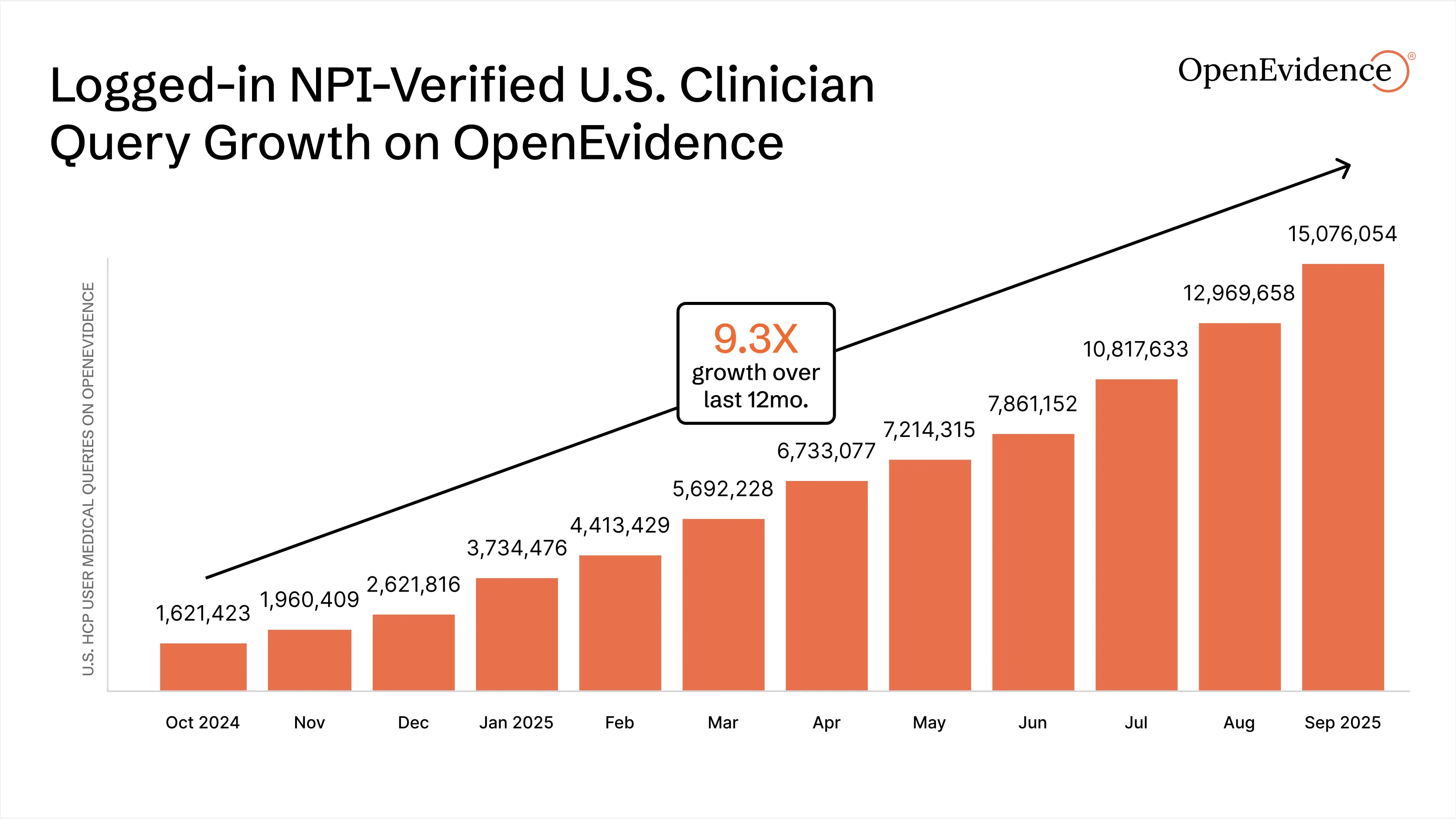 Physician usage is growing rapidly: Over the past year, OpenEvidence has grown 9x in query volume, now handling 15 million monthly medical questions from logged-in, verified U.S. doctors