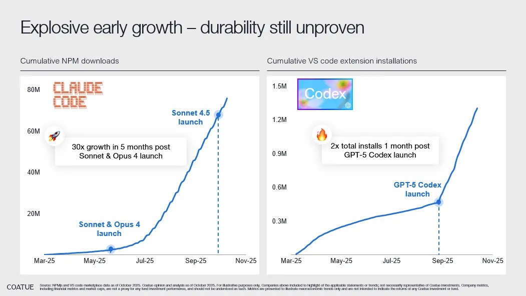 The steep usage curves indicate strong product-market fit for AI coding assistants and agents. By driving 20–40% in developer productivity, these tools justify premium pricing and accelerate seat expansion. The growth reflects compounding improvements in model capability and productization — reasoning, longer task length, agentic workflows — that are already translating into willingness to pay.