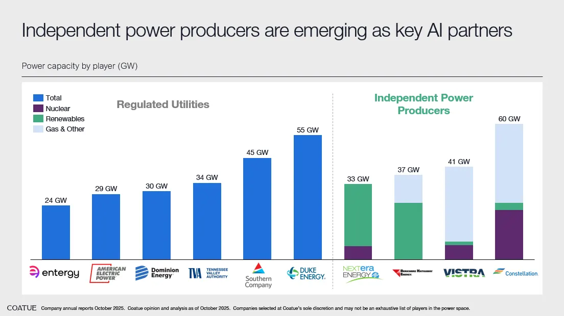 The universe of IPPs is not very large, and we are seeing in early agreements that many are choosing to go nuclear. Nuclear generation is baseload energy (24/7), clean, and produces a lot of power in one location. Amazon announced a transaction with Talen Energy in March 2024; Microsoft partnered with Constellation Energy in September 2024 to bring the Crane Clean Energy Center (formerly Three Mile Island) back online; and as recently as this October, NextEra Energy unveiled plans to restart its Duane Arnold nuclear plant in conjunction with Google.