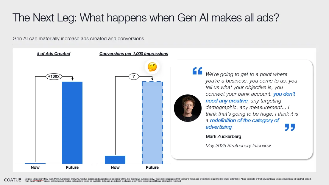 Where could this go next? Advertisers will generate far more creative, feeding models that continuously personalize and optimize. Conversion rates should increase meaningfully as models learn which creative works for whom and when. We expect revenue growth to follow — better matches drive more sales.