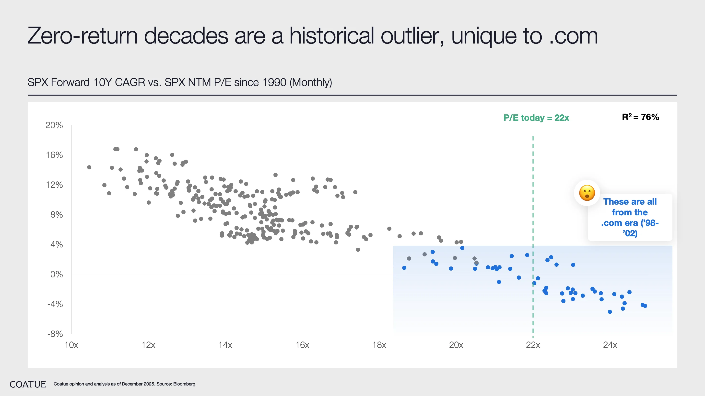 In our own work, we found the underlying data to be heavily influenced by a single extreme outlier: the dot-com era from 1998-2002. Viewed through a broader lens, the data suggest that valuation levels alone are a far weaker predictor of long-term returns than the chart implies.